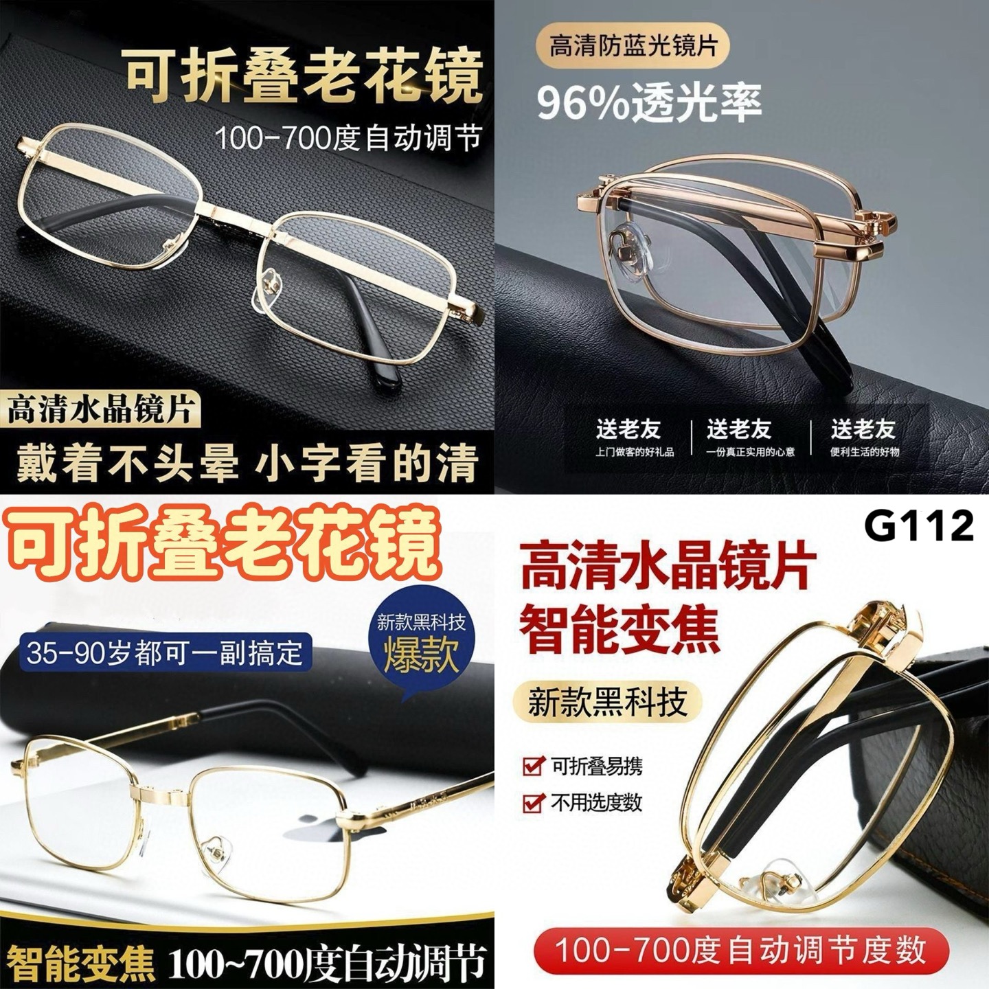 智能变焦,100-700度自动调节,高清水晶镜片,小字一看就清楚,防蓝光护眼,手机报纸都不怕,可折叠设计,出门携带超方便‼️‼️‼️