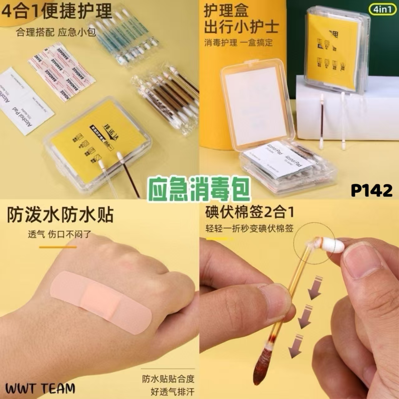 一套50件有:碘伏棉签、防水贴、酒精棉签、酒精棉片