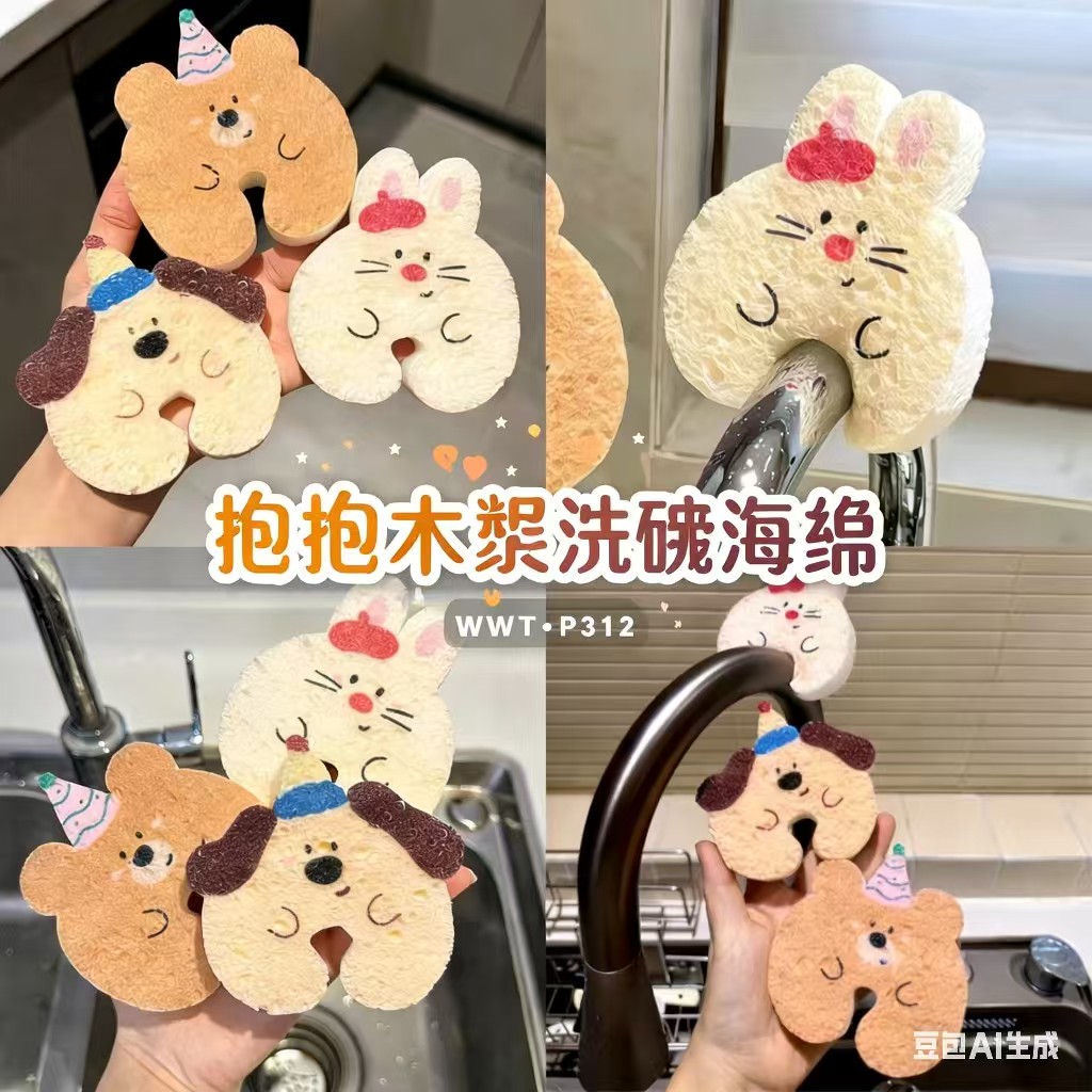 海绵柔软起泡好✨,洗碗、洗杯子都很方便,三个卡通各一个