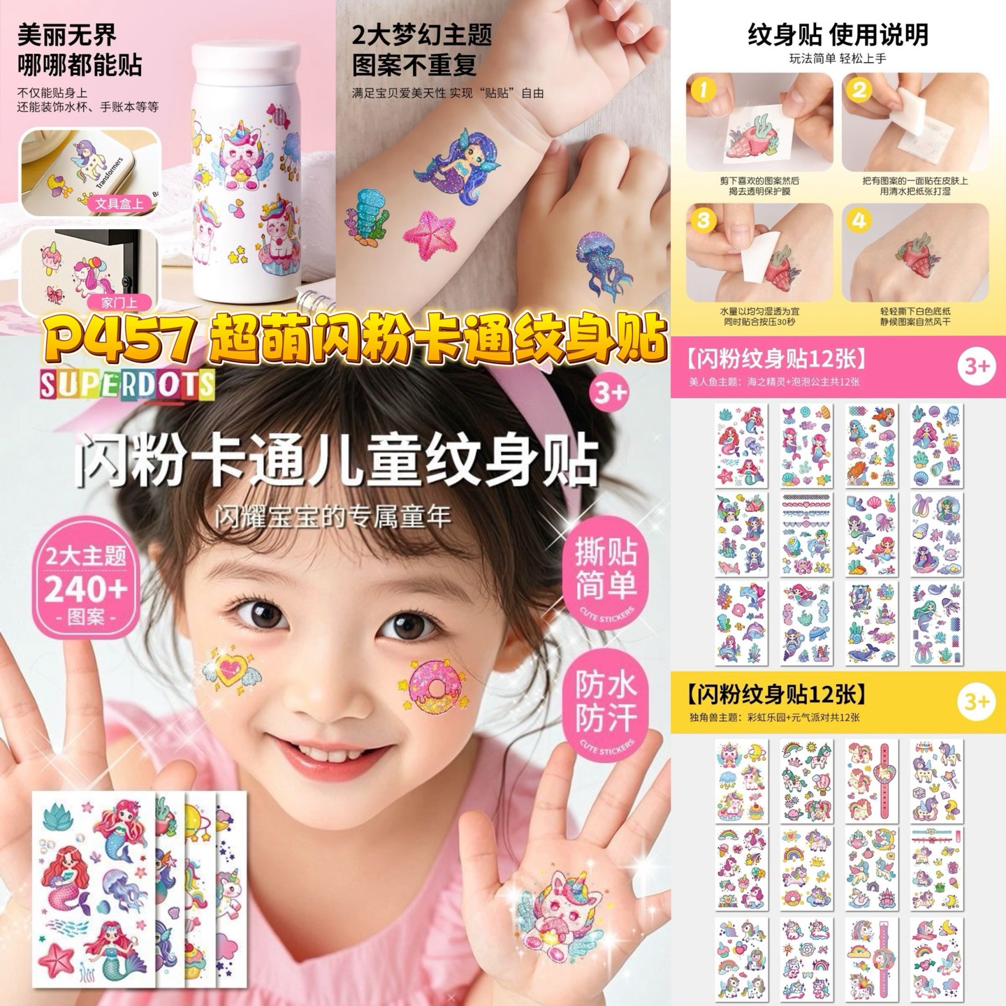 P457 超萌闪粉卡通纹身贴(1包12张)