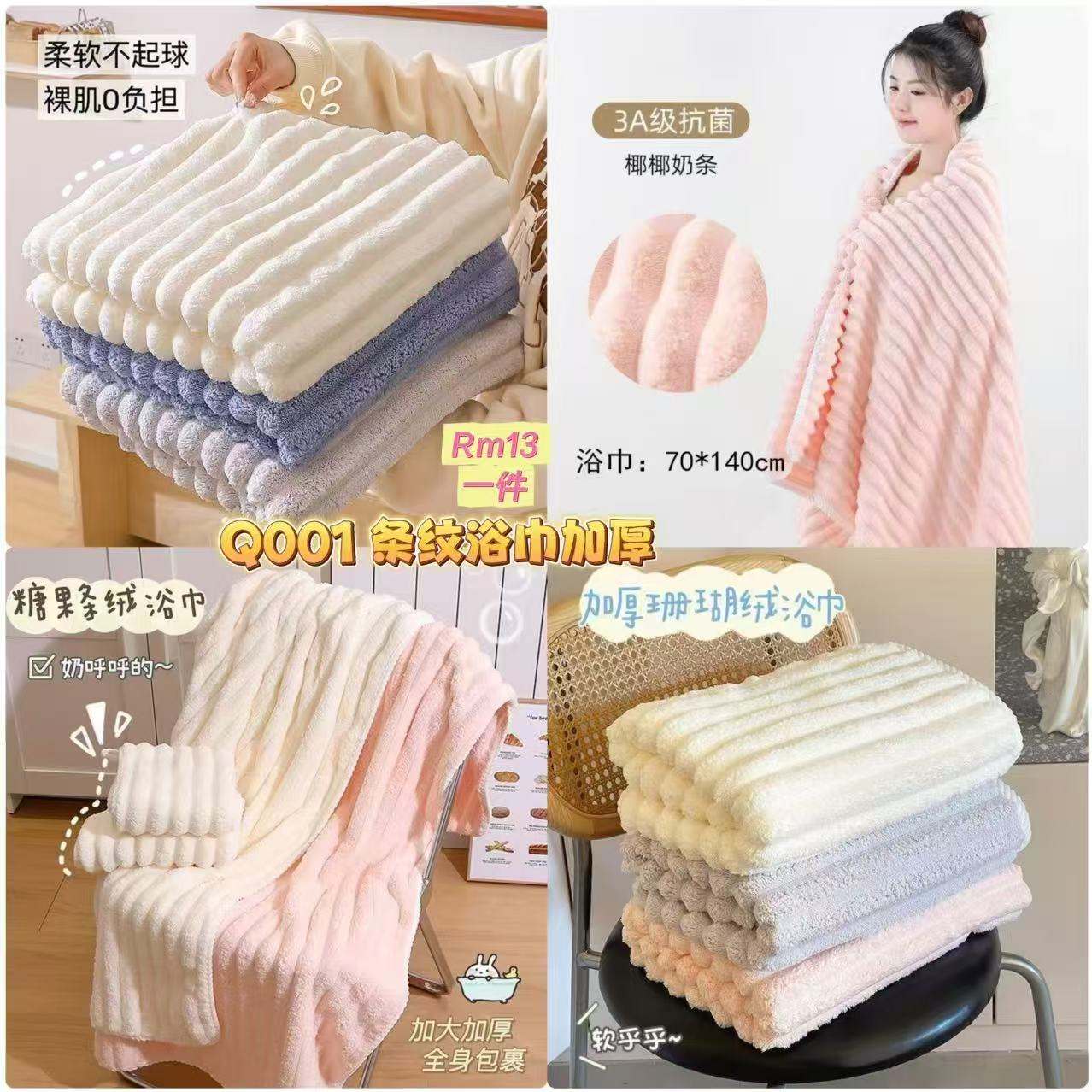 Q001 条纹浴巾加厚70*140cm 📦 #一件Rm13 颜色👉粉色 灰色 米色 蓝色