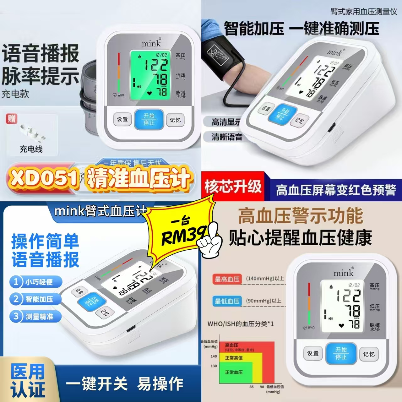 上臂式电子血压计高精准医用级 老人用血压测量仪家用语音播报充电器