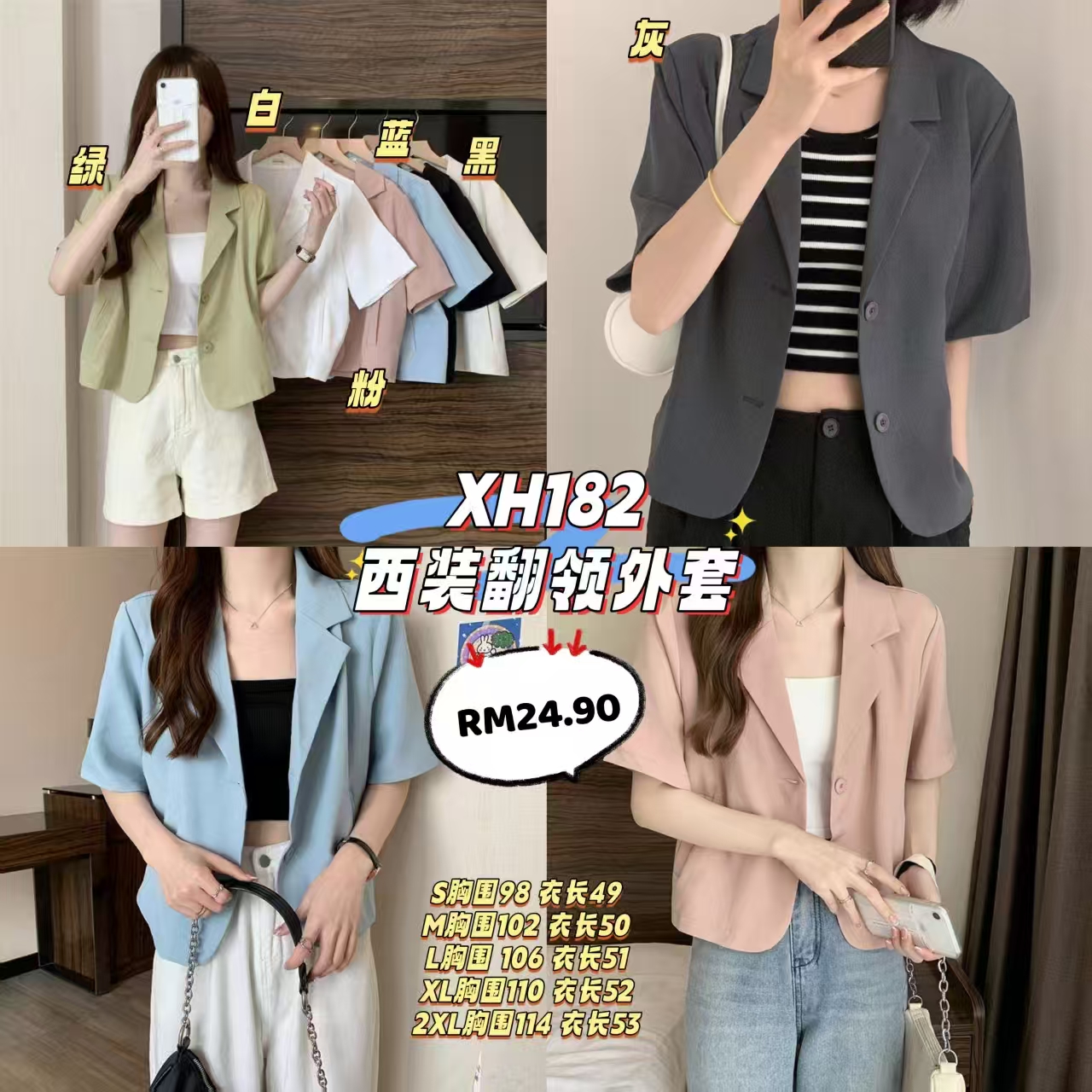 XH182 西装翻领外套 🛒 #一件Rm24.90 Size➡️S/M/L/XL/2XL 颜色➡️白/绿/黑/灰/蓝/粉