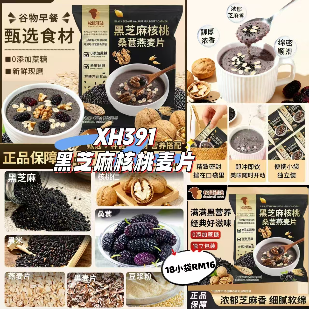 松鼠驿站黑芝麻核桃桑葚燕麦片,饱腹营养早餐粥